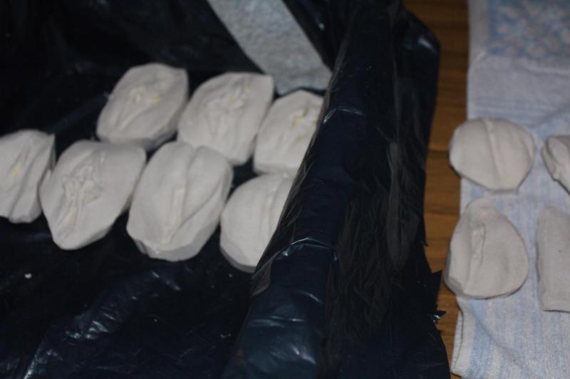 Unterschiedliche Frauen schenkten mir ihre Abdrücke. Sie wurden mit einem Mittel auf Algenbasis (vollkommen unschädlich, Zahnarzt nutzt es auch) hergestellt. Dann wurden diese mit Gips ausgegogssen, zusammengefügt und silikoniert. Die Form nutze ich für das Seifenleim. Einige Fotos dazu unten.